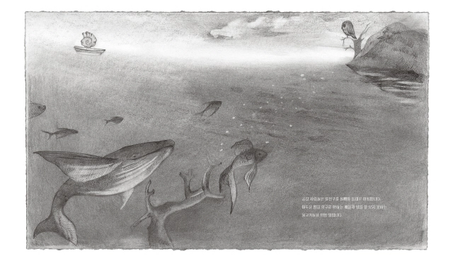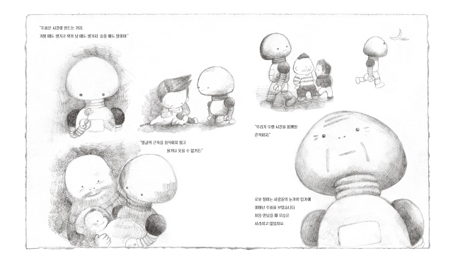 《로봇 철이》는 평범한 일상을 살아가는 공장 사람들과 로봇 철이의 모습을 그린 흑백 그림책입니다. 크게 변하지 않을 것 같은, 어쩌면 지루함이 반복되는 삶 속에서 유일한 변화는 조금씩 공장 사람들이 나이가 들고 있다는 것 뿐이지요. 하지만 《로봇 철이》가 누군가의 화려한 일상의 이야기가 아님에도 장면마다 시선이 머무는 까닭은 부드러운 흑연을 깔고 펜 터치로 정성스레 선을 쌓아 장면을 밝히는 명암과 공장 사람들의 평범한 일상을 환상적으로 표현한 장면들이 이야기를 입체적으로 만들기 때문입니다. 알전구의 불빛, 어두운 밤길을 밝히는 올빼미 등대의 불빛은 잔잔하면서도 환하게 땅을 비추는 달빛을 연상케 하고, 공장 사람들과 로봇 철이가 거대한 달팽이 몸과 버섯 위에 옹기종기 모여 앉은 모습에는 공동체를 이루며 사는 사람들의 다정함이 담겨있습니다.