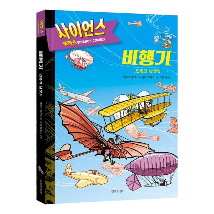 ‘사이언스 코믹스’ 시리즈 제7권 『비행기: 인류의 날갯짓』은 라이트 형제의 여동생 캐서린 라이트가 들려주는 그들의 이야기입니다. 캐서린은 실제로 라이트 형제와 매우 친했습니다. 그들이 만든 비행기를 세상 사람들에게 알리는 데 큰 도움을 주기도 했습니다. 책 속에서 캐서린은 라이트 형제를 비롯한 당대 항공학자들을 소개하며 초기 비행기의 모습과 발달 과정을 알려 줍니다. 라이트 형제가 어린 시절 ‘박쥐’라는 헬리콥터 장난감을 가지고 놀며 비행에 흥미를 느낀 순간부터 마침내 첫 비행에 성공하기까지, 이후 프랭크 휘틀이 터보 제트 엔진을 개발해 오늘날 비행기 모습의 토대를 마련하기까지, 포기할 줄 모르던 항공학자들의 불꽃같은 열정이 펼쳐집니다. 단 한 세기 만에 놀라운 발전을 이룬 비행기 이야기 속으로 떠나 보세요!