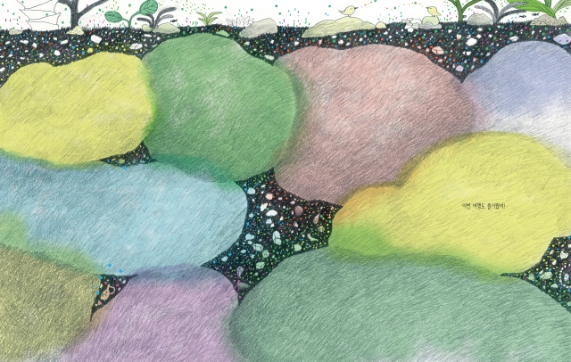 그렇게 한참을 사람들 곁에 내리던 비가 이제 땅속 깊은 곳까지 모두 다 내려갑니다. 그곳에서 작은 씨앗에 생명력을 불어넣으며 비의 여행은 끝이 나는 듯 보이지만, 푸른 싹이 움트고 비는 다시 하늘로 올라갈 준비를 하며 또 다른 여행을 기약합니다. 세상에 위로와 쉼을 주고 성장을 돕는 비의 여행은 앞으로도 계속됩니다.