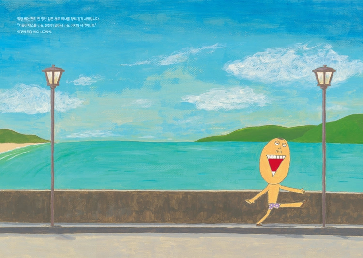 이 그림책은 적당 씨의 출근길 이야기를 담고 있다. 아침에 늦게 일어난 적당 씨. 보통 사람이라면 눈꼽만 떼고 회사로 뛰어갈 법하지만 적당 씨는 팬케이크를 만들고 모카포트로 커피를 내려 강아지 해피와 함께 아침을 먹는다. 식탁 뒤 레코드판에서는 음악이 흘러나오고 온갖 책들과 아기자기한 소품들, 정성껏 가꿔진 식물이 보인다. “서둘러 뛰어가도 천천히 걸어가도 어차피 지각이니까.” 정류장으로 가는 길에는 꽃을 감상하고 버스에서 내릴 곳을 놓쳤을 때도 손으로 턱을 괴고 평소와 다른 풍경에 빠져든다. 그렇게 우연히 내린 곳에는 아름다운 바다가 펼쳐져 있다. “분명 일하러 가고 있었는데 바다에 오게 되다니… 왠지 운이 좋은걸!” 그러고는 바다로 들어가 자유롭게 물속을 누빈다. 자유형도 배영도 아닌 딱 적당 씨다운 ‘적당 수영’에 주변 사람들이 박수를 보내기까지!