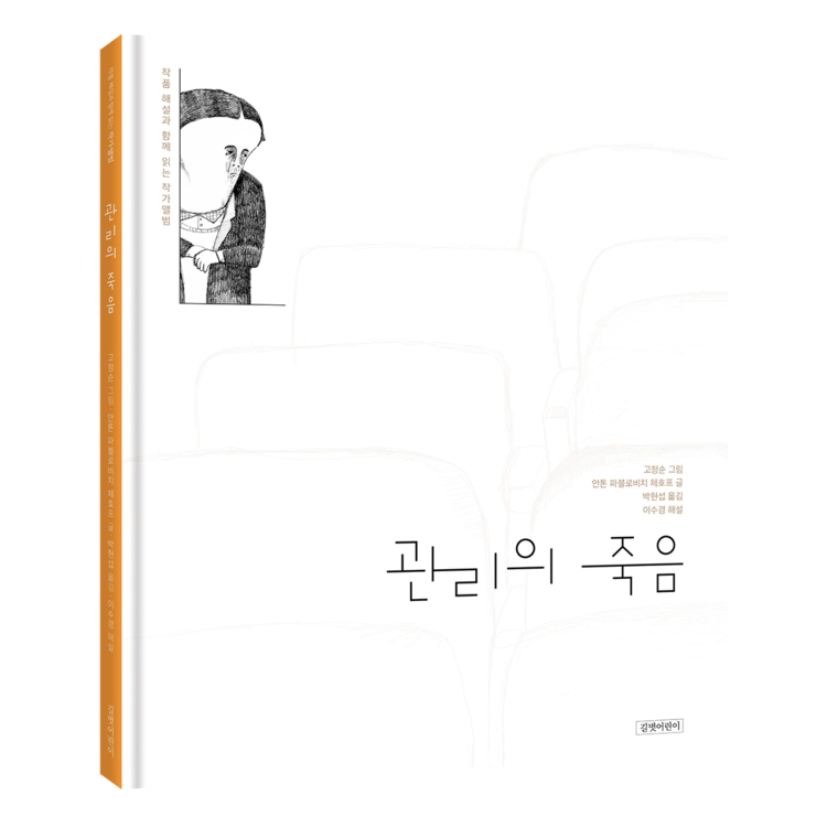 안톤 체호프의 단편 소설 〈관리의 죽음〉은 사소한 일에 병적으로 집착한 회계원 이반의 이야기를 담고 있다. 세계적인 단편 소설의 대가이자 뛰어난 극작가였던 체호프의 〈관리의 죽음〉은 강렬한 캐릭터와 이야기로, 마치 한 편의 연극이 펼쳐지는 듯하다. 고정순 작가는 이러한 점을 예민하게 포착해, 마치 연극의 막이 오르고 내리기까지의 과정을 보듯 이야기를 구성하고, 끊어질 듯 아슬아슬하고 날카로운 펜 선 그림으로 이미지를 극대화하며 표현해 냈다. 고정순 작가가 만들어 낸 무대 위에서 한껏 과장된 표정을 짓고 몸짓으로 공연하는 주인공 이반의 모습을 통해, 독자들은 그림책을 보는 동안 작은 소극장 맨 앞자리에 앉아 오감으로 연극을 보는 듯한 기분을 한껏 느낄 수 있을 것이다.
