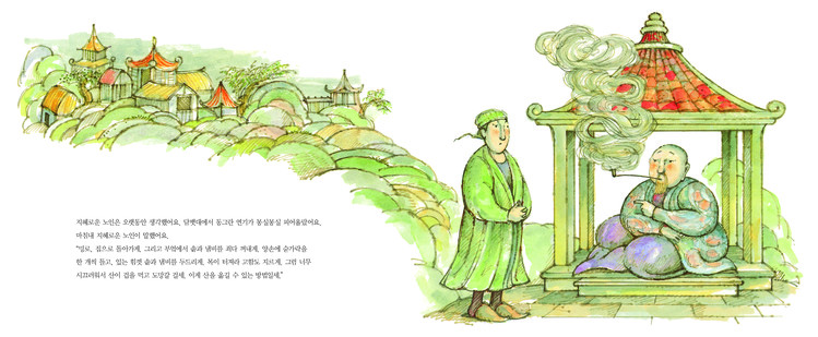 지혜로운 노인은 밍로가 찾아올 때마다 산을 옮기는 방법을 열심히 고민하고 알려 줍니다. 통나무로 산을 힘껏 밀어내기, 소란을 피워 산을 멀리 쫓아내기, 산신령에게 제물을 바쳐서 산을 옮겨 달라고 부탁하기. 마을에서 가장 지혜롭다는 노인이었지만, 그가 알려 준 방법들은 이렇듯 하나같이 어리석기 짝이 없었어요. 게다가 거듭되는 실패 끝에 마지막으로 찾아온 밍로에게 알려 준 ‘산을 옮기는 춤’은, 사실 산으로부터 멀리 떨어진 곳까지 ‘집을 옮기는 춤’이었지요. 하지만 아무려면 어때요. 밍로와 아내는 지혜로운 노인의 가르침을 진지하고 충실히 따른 덕분에 아늑한 보금자리를 얻었고, 스스로 산을 옮겼다는 생각에 뿌듯하고 행복했으니 그걸로 충분하지요.