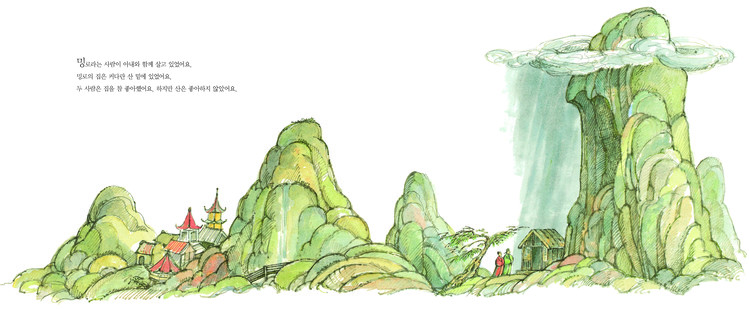 밍로라는 사람이 아내와 함께 커다란 산 밑에 살고 있었어요. 밍로 부부는 산 때문에 하루도 마음 편할 날이 없었지요. 산에서는 툭하면 돌덩이들이 굴러떨어져 지붕을 뻥뻥 뚫어 놓았고, 산꼭대기에 걸린 비구름 때문에 집과 마당은 늘 어두컴컴하고 눅눅했어요.