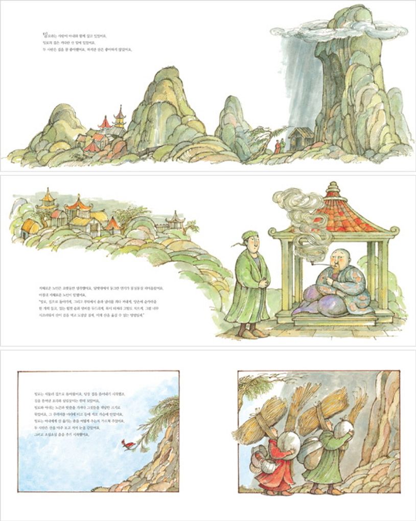 밍로와 아내는 커다란 산 밑에 살았습니다. 산에서 툭하면 돌이 떨어지고, 산꼭대기 비구름 때문에 마당은 그늘져 풀 한 포기도 자라지 못했습니다. 두 사람에게는 산이 골칫거리였던 것이죠. 어느 날 밍로의 아내는 참다못해 “이 집에서 마음 놓고 살려면 저 산을 다른 데로 옮겨야 겠다”고 말했습니다. 과연 밍로처럼 작은 사람이 큰 산을 어떻게 옮길 수 있을까요?