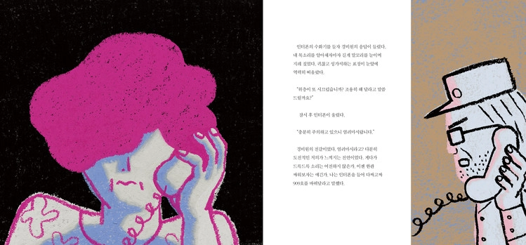 국내외에서 많은 사랑을 받고 있는 조원희 작가는 이해와 배려가 사라지는 각박한 현대 사회 속 이웃 간의 갈등을 간결하면서도 강렬하게 그려냈습니다. 극명하게 대비되면서도 서로 어우러지는 색의 조합은 마치 비슷한 듯 전혀 다른 개개인이 모인 사회를 보여주는 듯합니다. 또 천장을 가득 메운 정체모를 소음과 인터폰을 사이에 두고 오가는 날카로운 억양들을 표현한 거칠고 날카로운 선은 책을 읽는 독자들의 시선을 사로잡으며 몰입감을 주는 동시에 팽팽한 긴장감도 느끼게 합니다.