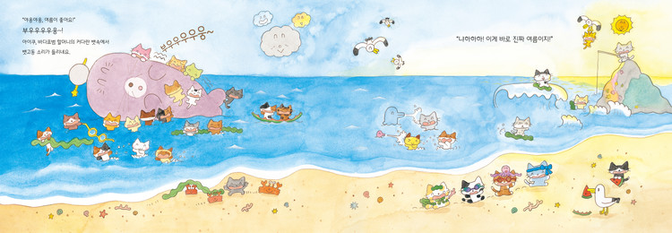 “야옹야옹♬” 고양이들의 재잘거림으로 조용하던 할머니의 오두막은 어느새 시끌벅적해졌고, 애타게 찾던 진짜 여름은 바다표범 할머니와 함께 바다 위를 둥둥 떠다니며 오감으로 느낄 수 있게 되었답니다.