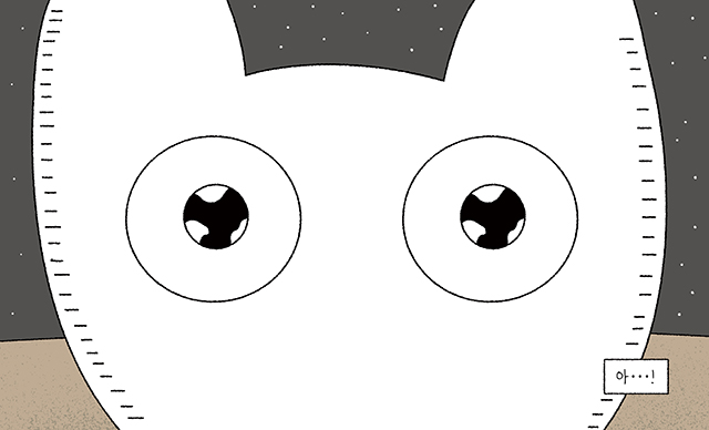 토끼를 닮은 기다란 귀와 동그랗게 보이는 눈, 그리고 동그란 배 위로 빨갛게 빛나는 동그라미! 우주복을 벗으면 또 다른 반전 외모까지 보여 주는 외계 생명체 새로의 모습입니다. 정진호 작가의 그래픽 노블 그림책 《나의 달을 지켜 줘》는 그리던 존재(지구)를 위해 용기를 내고, 그 존재를 진심을 다해 사랑하는 새로의 이야기를 담고 있습니다.