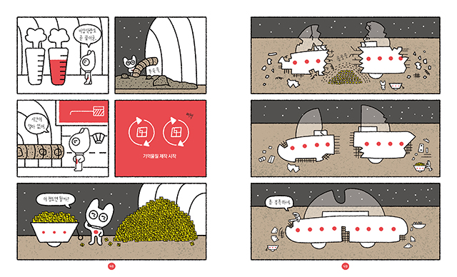 달토끼들은 새로를 구한 것에서 그치지 않고, 깊숙한 곳에 숨겨 둔 우주선을 새로에게 선물로 줍니다. 집으로 무사히 돌아가길 바라는 마음을 담아서요.