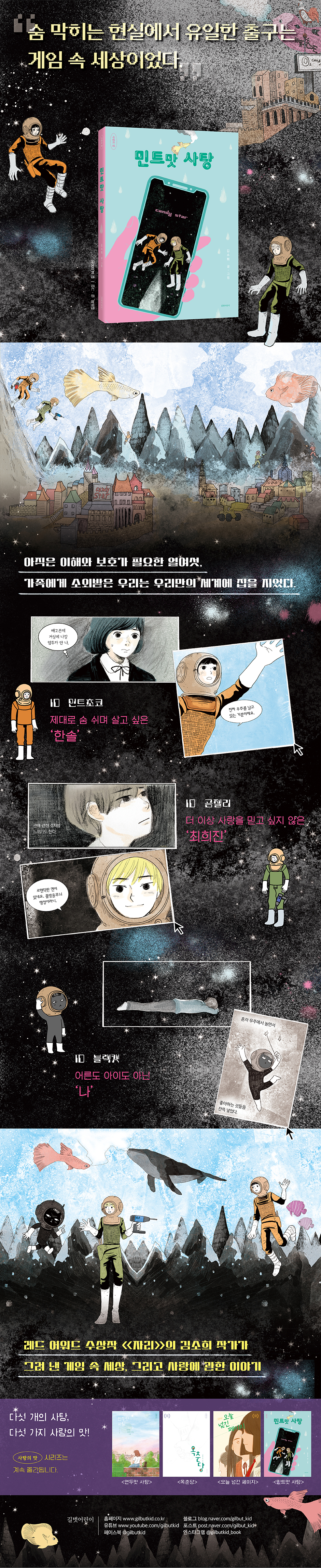 게임 세상에서 민트초코는 시크하면서 어른스러운 곰젤리와 장난꾸러기 같지만 어딘지 미스터리한 블랙캣과 친구가 되어, 서로의 이야기를 나누면서 현실에서 쌓인 스트레스를 풀고 서로에게 기댈 어깨를 내어 줍니다. 게임 세상에서 맛본 산소 사탕은, 마치 민트맛 사탕처럼 이들의 답답했던 속을 뻥 뚫어 주었습니다. 솔이와 희진이, 그리고 어른이 되지 못한 선생님은 숨 막히는 현실에서 다시 ‘숨’을 내쉴 수 있을까요?