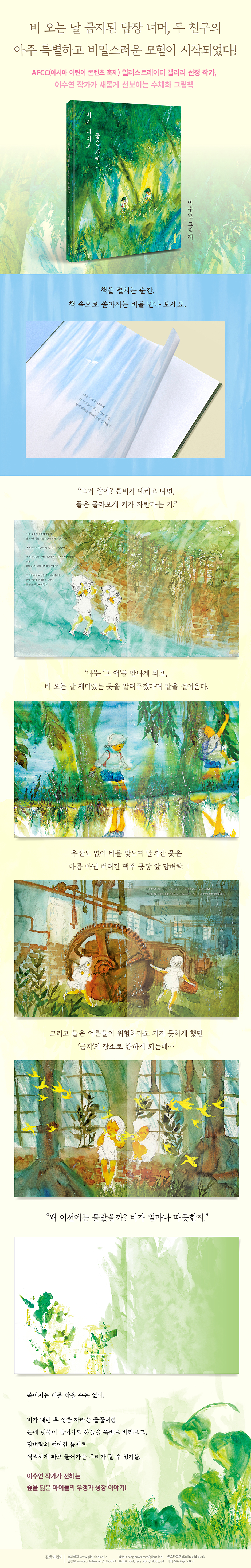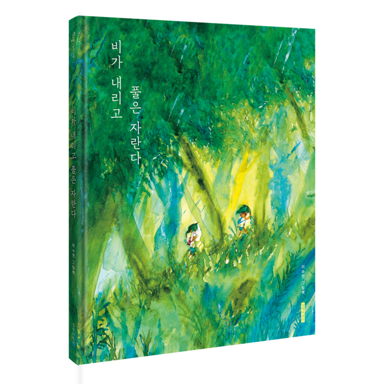 두 아이의 특별한 모험을 그린 《비가 내리고 풀은 자란다》에서는 이수연 작가의 14년 전의 초창기 투명 수채화 그림과 서정적인 문체가 담겨 있습니다. 표지의 맑은 수채화로 그려진 우거진 나무숲은 신비스러운 분위기를 자아내고, 학교와 숲 그리고 맥주 공간으로 공간이 바뀜에 따라 변하는 아이들의 심리와 관계를 세밀하게 묘사하며 이야기를 만들어갑니다.