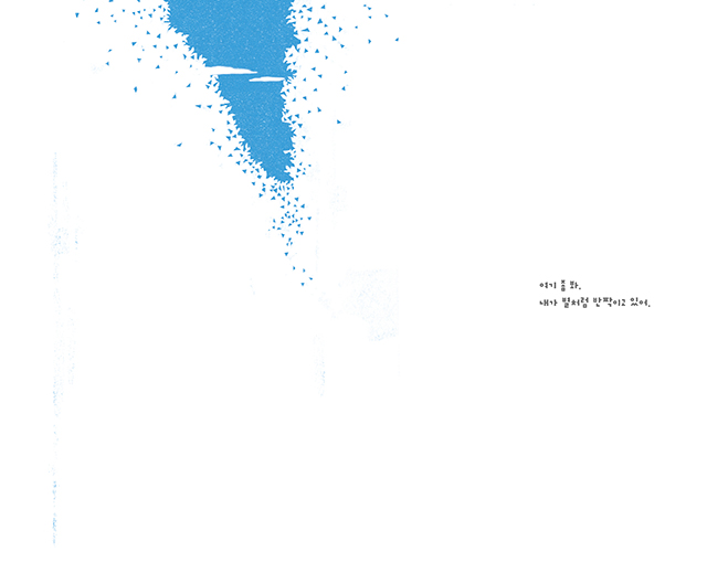 그리고 마침내 아이의 발이 동그란 물웅덩이 앞에 멈춰 선 순간. “와, 하늘이 땅에 있다.” 파란 하늘과 아이가 마주하며, 아이의 눈에 빛나는 하늘이 담깁니다. “아빠, 이것 좀 봐. 이게 뭐게?” 하늘을 향해 자그마한 손가락을 오므리며 아이가 물었어요. “내가 만든 하늘이야.” 아이의 손에서 새롭게 태어난 하늘 조각 새는 하늘 높이 날아올랐어요.