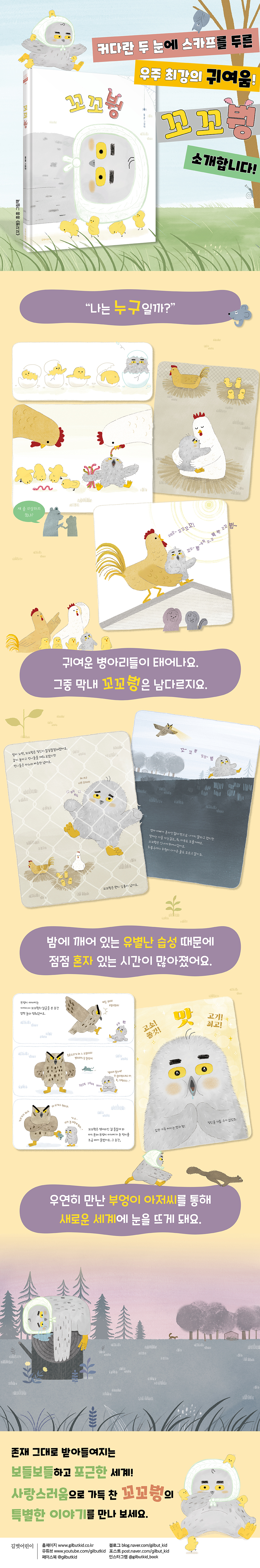 언니 병아리들보다 훨씬 우람하고 튼튼하지만, 가족들에게는 한없이 보살펴 주고 싶고 돌보아 주고 싶은 막내일뿐인 사랑스러운 꼬꼬붱! 자신을 감추려고 애썼던 꼬꼬붱이 결국 자기의 진짜 모습을 찾아가는 과정을 읽다 보면 애처롭고도 간절한 몸부림에 웃음이 나오다가도 가슴 한편이 뭉클해 지면서 꼬꼬붱과 가족들을 진심으로 응원하게 될 거예요. 나 자신을 사랑하는 법, 그리고 서로의 다름을 존중하는 것이야말로 진정한 가족의 의미임을 깨닫게 하는 따뜻한 이야기, 사랑스러움으로 가득 찬 꼬꼬붱의 특별한 이야기를 만나 보세요.