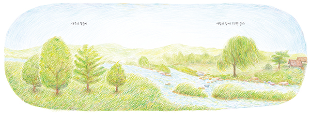 평화로운 물가 풍경이 아름다운 책의 표지를 넘기면 맑은 물이 흐르는 하천을 따라 다양한 동물들이 사는 숲과 사람들이 사는 집이 평화롭게 어우러진 장면이 나타납니다. 이후 노랑할미새 부부를 따라 자연 속 장면들을 하나씩 하나씩 더욱 섬세하게 펼쳐지지요. 하늘 높이 떠서 숲을 따스하게 비추는 노란 해, 나무 근처 돌들 사이로 시원하게 흐르는 계곡물, 나무와 꽃들 사이로 포근한 바람이 솔솔 부는 물가와 그곳을 서식지로 삼고 살아가는 노랑할미새의 모습을 사실 그대로 그려 냅니다. 노랑과 초록이 가득한 부드러운 색연필로 그린 그림은 자연에 대한 작가의 애정과 간절함을 고스란히 보여 줍니다.
