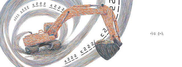 반면 이야기의 중반부에 위협적인 모습으로 등장하는 굴삭기, 맑은 물이 온통 흙탕물이 되는 장면, 산이 깎인 자리에 들어선 높은 빌딩들, 콘크리트로 정돈된 하천의 모습은 앞에서 보았던 평화로움과 극명하게 대비되면서 무분별한 개발과 도시화의 위험성을 시각적으로 극대화하며 우리에게 생각할 거리를 던져 줍니다.
