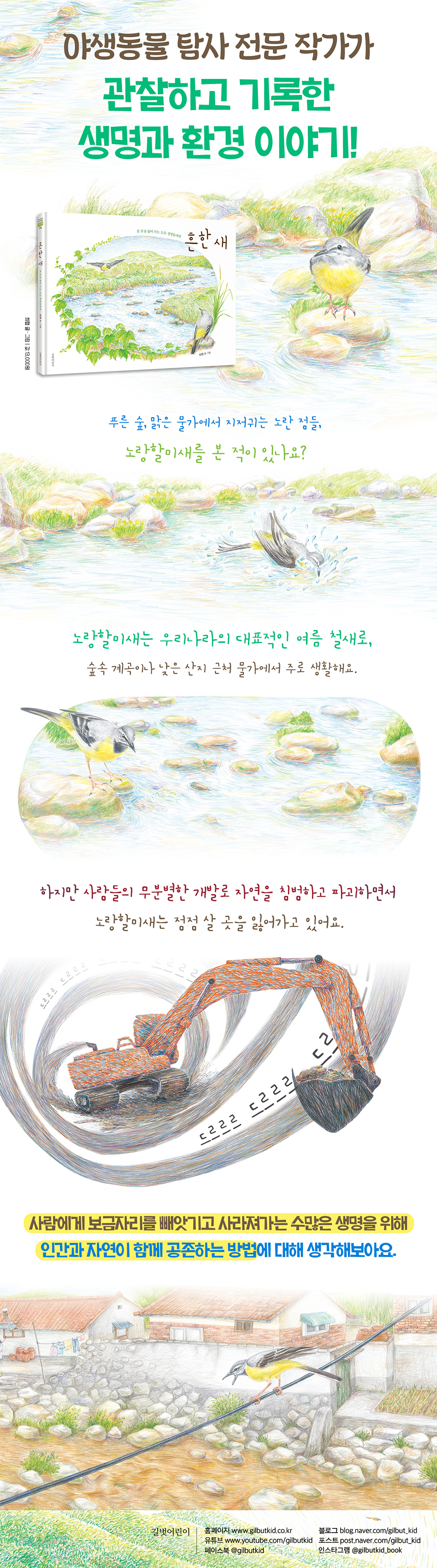 이 책은 우리 주변에 살 곳을 잃어 가는 모든 생명들에게 더 늦기 전에 관심을 기울여야 한다고 조용히 속삭입니다. 결국 인간도 자연을 떠나서는 살 수 없는 생명이니까요. ‘흔한 새’라는 별명이 무색할 정도로 갈수록 만나기 힘든 노랑할미새처럼, 우리는 그동안 알지 못하는 사이에 수많은 생명들을 잃어 가고 있었던 건 아닐까요?