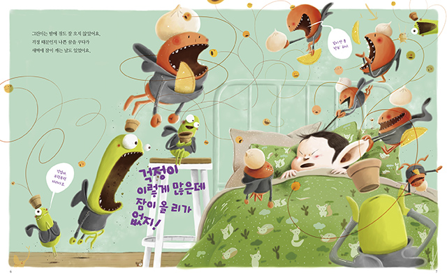 축 처진 기분 탓에 그린이는 그만 친구 준혁이에게 불쑥 화까지 내고 맙니다. 친구에게 상처를 주었다는 미안함에 걱정이 더 많아진 어느 날 밤, 그린이 눈앞에 ‘진짜’ 걱정 괴물이 나타납니다. 이럴 수가! 걱정 괴물이 정말로 있었다니…. 걱정 괴물은 밤새 그린이 주변을 따라다니면서 달콤한 잠을 방해합니다.