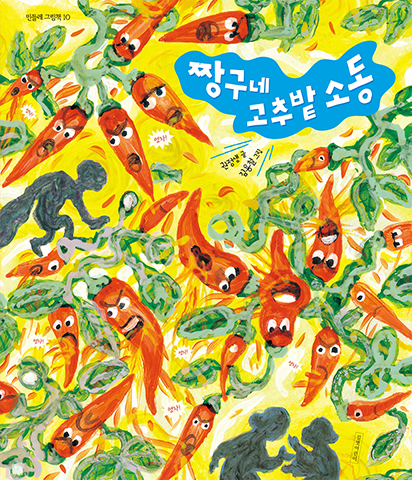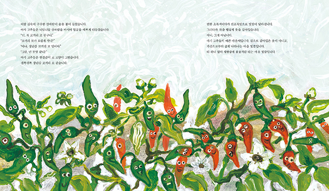 생전에 권정생 작가는 김용철 작가의 그림을 보며 자신의 이야기를 제일 잘 표현하는 작가라며 칭찬했습니다. 아마도 김용철 작가 특유의 유머와 익살로 작품 속에 담긴 해학을 눈앞에 펼쳐지는 이미지로 풀어냈기 때문이겠지요. 권정생 작가의 작품들 중 가장 유쾌하게 쓰인 《짱구네 고추밭 소동》을 김용철 작가가 소박하지만 개성 있고, 익살스러운 그림으로 더욱 멋지게 완성했습니다. 특히 이야기를 이끌어 가는 주요 등장인물인 아기 고추들을 다양한 표정과 강렬한 색감으로 표현하여 마치 살아 있는 듯한 생명력을 불어넣었습니다. 고추밭 아기들이 고추 줄기에서 몸을 흔들며 기쁨을 나타내거나 입에서 불을 뿜고 이를 바득바득 갈며 화를 표출하는 동안, 독자들은 그 모습을 따라 함께 웃고 화내면서 이야기 속에 점점 빠져들게 됩니다. 또한 새빨간 아기 고추들의 강렬하고 화려한 색감은 작지만 매운 고추의 특징을 돋보이게 하고, 자유로우면서도 거친 붓 터치는 이야기의 몰입을 더욱 극대화해 줍니다.