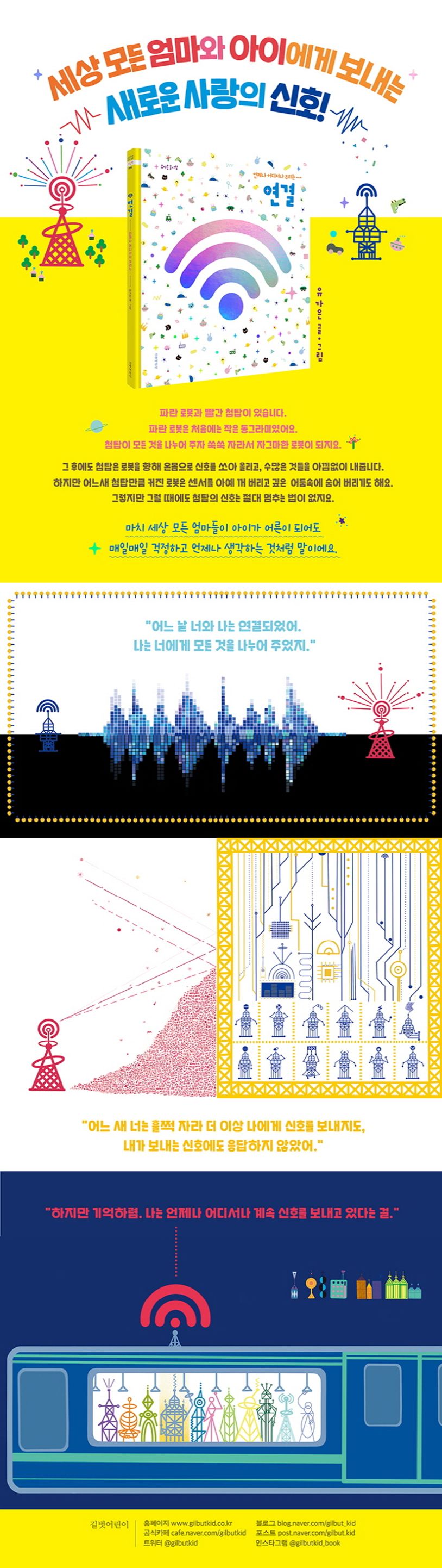 여기, 기발한 발상과 독창적인 그림으로 색다른 감동을 선사해 줄 그림책이 출간되었습니다. 《연결 : 언제나 어디서나 우리는…》은 엄마가 사랑하는 아들에게 들려주는 이야기로, 엄마와 아이가 교감하고 사랑하는 모습을 두 개의 와이파이 기기가 전파를 보내고 서로 신호를 주고받는 것에 빗대어 표현한, 독특하고 참신한 작품입니다. 요즘 어린이 독자들에게 친숙한 와이파이 신호를 소재로 하여 배 속에 있는 순간부터 이별의 순간까지 아이의 모든 순간을 기록하고 그 속에 엄마의 따뜻한 응원과 깊은 사랑을 뭉클하게 그려 낸 이 책은, 때로는 뜨겁게 사랑하고, 때로는 갈등하기도 하면서 서로의 마음을 주고받으며 성장하는 엄마와 아이 이야기를 감각적이고 세련된 일러스트로 표현해 새로운 감동을 안겨다 줍니다.