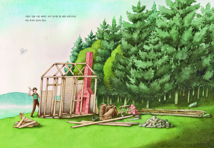 푸른 잎과 새싹으로 뒤덮인 봄, 소로는 널빤지와 석회로 작은 오두막을 짓고, 꼭 필요한 최소한의 가구들로 집을 꾸밉니다. 그리고 새들과 친구가 되며 자연을 마음껏 느낍니다. 찬란하게 빛나는 햇빛에 땀이 송글송글 맺히는 여름에는 소로는 직접 콩밭을 일구며 스스로 자급자족하는 방법을 배웁니다. 또 호수에서 목욕을 하고, 초원에 핀 들꽃 속에서 휴식을 취하며 숲속 생활을 그 자체로 즐기지요. 선선한 가을이 가고 사나운 눈보라가 치는 겨울에는 그동안 부지런히 마련해 둔 장작으로 벽난로에 불을 지핀 다음 시간가는 줄 모르게 책을 읽기도 하고, 또 꽁꽁 언 호수 위에서 미끄럼을 타며 고드름이 주렁주렁 달린 나무들을 감상하기도 합니다. 그리고 새로운 봄의 시작을 알리는 새들의 노랫소리를 들으며 소로는 어느 때보다 생기 넘치는 새해를 맞이합니다.
