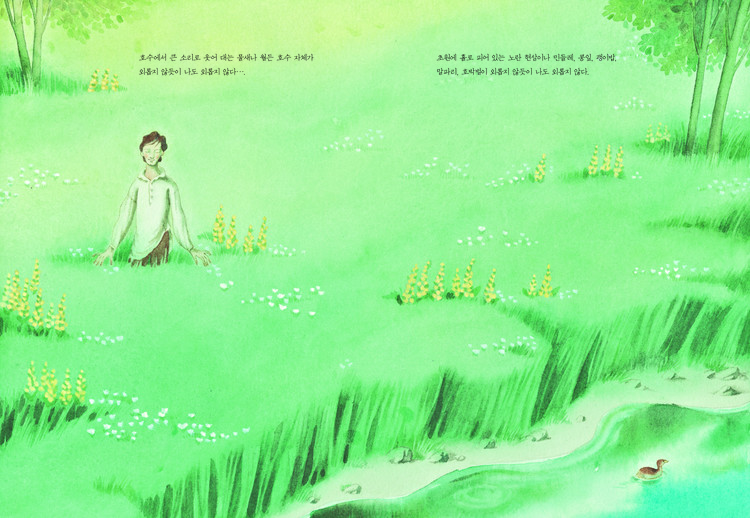잔잔하고 고요한 호숫가, 숲속의 작고 소박한 오두막, 촉촉한 이끼 카펫이 깔린 소나무 숲 응접실, 마치 거울처럼 투명하게 빛나는 호수 등 아름다운 숲의 풍경이 그대로 담긴 수채화는 독자들을 숲 한가운데로 초대합니다. 아침에 일어나 잠이 들 때까지 소로가 마음껏 누렸을 월든 호숫가의 풍경을 보면서 물질적, 육체적으로는 지극히 소박하면서도 정신적으로는 더할 나위 없이 충만했던 소로의 생활을 느껴볼 수 있을 것입니다. 소로의 서정적인 문장들이 안데르센 상 수상 작가의 따뜻한 수채화와 함께 어우러진 그림책 《월든 _ 숲에서의 일 년》은 독자들에게 고전 작품을 아름다운 그림과 함께 부담 없이 만나 보는 기회를 선사할 것입니다.