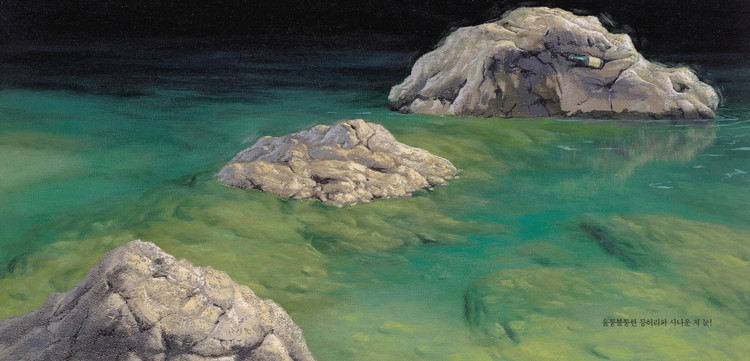 김재홍 작가는 자연의 아름다움을 화폭에 담아온 화가입니다. 동강 물과 숲의 아름다움과 그 안에 숨겨진 모습들을 주제로 한 '그림 속의 숨은 그림'전을 열기도 했습니다. 이야기의 구성은 특별할 것 없지만, 실제 동강의 풍경을 유화로 옮긴 환상적인 그림들이 생생하게 다가옵니다.