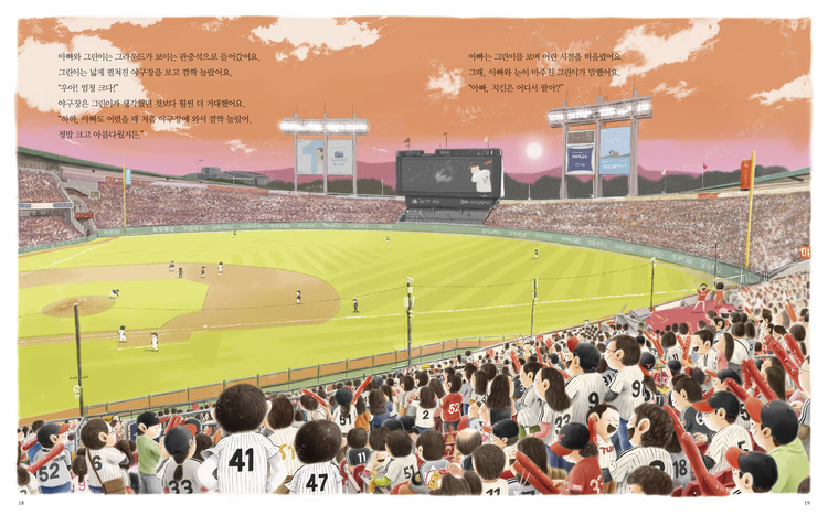 이쪽에서 저쪽으로 공 주고받기를 하는 그린이와 아빠의 모습, 아빠가 제일 좋아하는 최고의 투수 이상훈 선수의 멋진 활약상, 야구장 식당가에서 여기저기 신이 나 돌아다니며 무엇을 먼저 먹을까 행복한 고민을 하는 그린이의 모습, 거대한 파도타기 응원을 하는 관중석의 모습은 마치 야구장에 있는 듯 생생한 현장감을 전달해 줍니다.