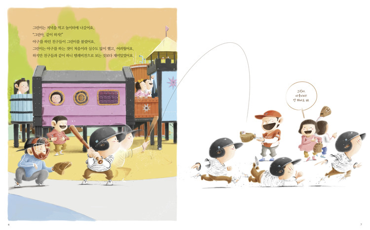 그린이가 야구에 관심을 보이자 아빠는 그 어느 때보다도 기뻐합니다. 오랜 야구팬인 아빠가 제일 좋아하는 운동 경기를, 사랑하는 아이와 함께 볼 생각을 하면 신날 수밖에 없겠지요.