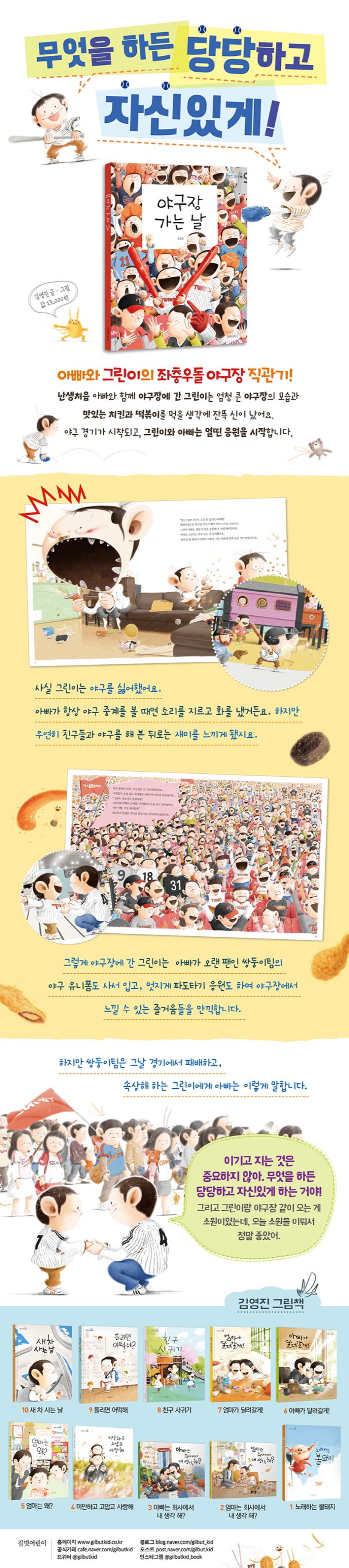 마치 어제 우리 집에서 있었던, 우리 집 이야기를 보는 듯, 생동감 넘치는 이야기로 많은 사랑을 받고 있는 ‘아빠 작가’ 김영진이 이번에는 실제로 열혈 야구팬인 자신의 경험을 살려 생생하고 재미있는 야구장 이야기를 들려줍니다.