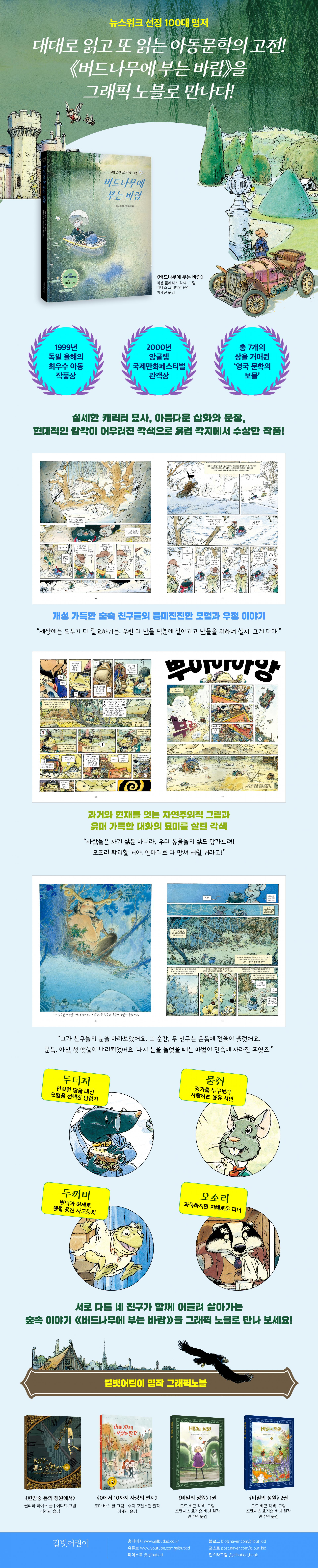 한 세기 전에 영어로 쓴 영국 문학이 그래픽 노블로 재탄생했고, 그 작품이 다시 오늘날의 한국 독자에게 와닿을 수 있도록 세심하게 다듬어 옮긴 번역 역시 이 작품에 묘미를 더한다. 젊은 독자들의 입말과 정서를 고려하여 세련되게 가공한 문장들이 책장을 넘길수록 빛난다. 눈으로 즐기는 즐거움, 입으로 자꾸만 소리 내 읽어 보고 싶은 재미로 가득한 《버드나무에 부는 바람》을 통해 다시 읽는 고전의 가치를 느껴 보자.
