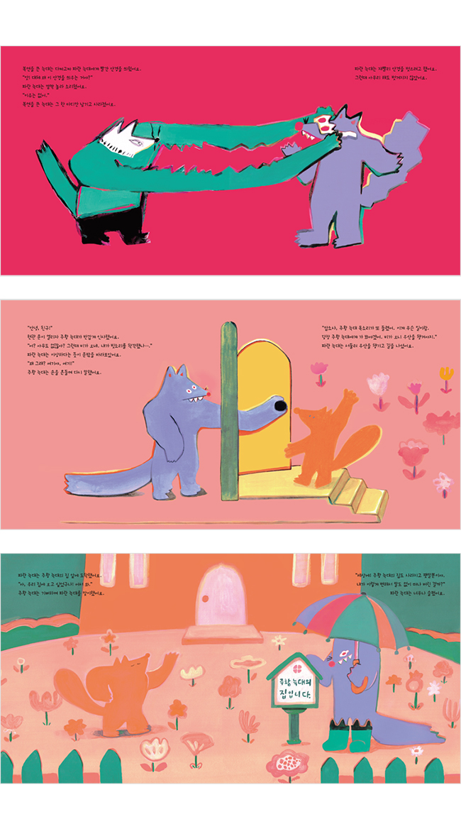 사실, 주황 늑대는 줄곧 파란 늑대의 곁에 있었어요. 주황 늑대도 처음에는 평소와 다르게 이상한 행동을 하는 파란 늑대를 보며 화가 나기도 하고, 당황스럽기도 했어요. 하지만 친구의 말에 귀 기울이고 그 친구의 입장이 되어 감정을 그대로 이해하려고 노력했지요. 덕분에 파란 늑대는 보이지 않아도, 주황 늑대의 따뜻한 마음을 그대로 느낄 수 있었어요. 변함없이 곁을 지키겠다는 친구의 말에 안심하고 행복해 하면서요.