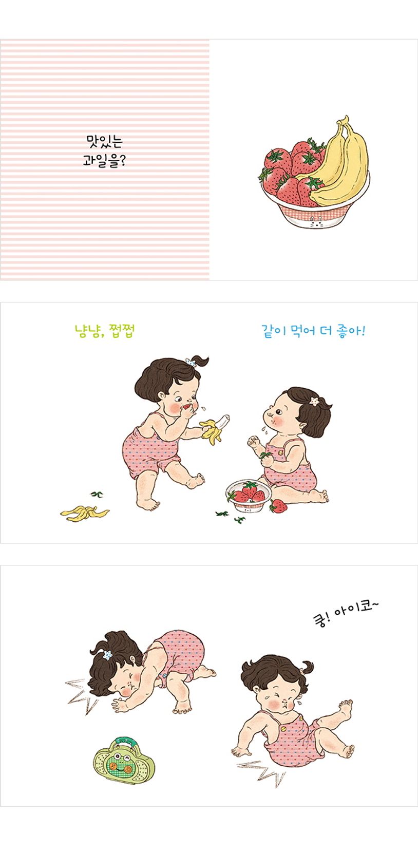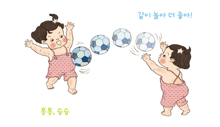아기들이 평소 좋아하는 놀이와 소품들이 ‘냠냠 쩝쩝’, ‘퐁퐁 뽁뽁’, ‘영차 영차’, ‘실룩 샐룩’처럼 다양하고 풍성한 의성어, 의태어들과 함께 등장해 운율감도 한껏 살렸습니다.