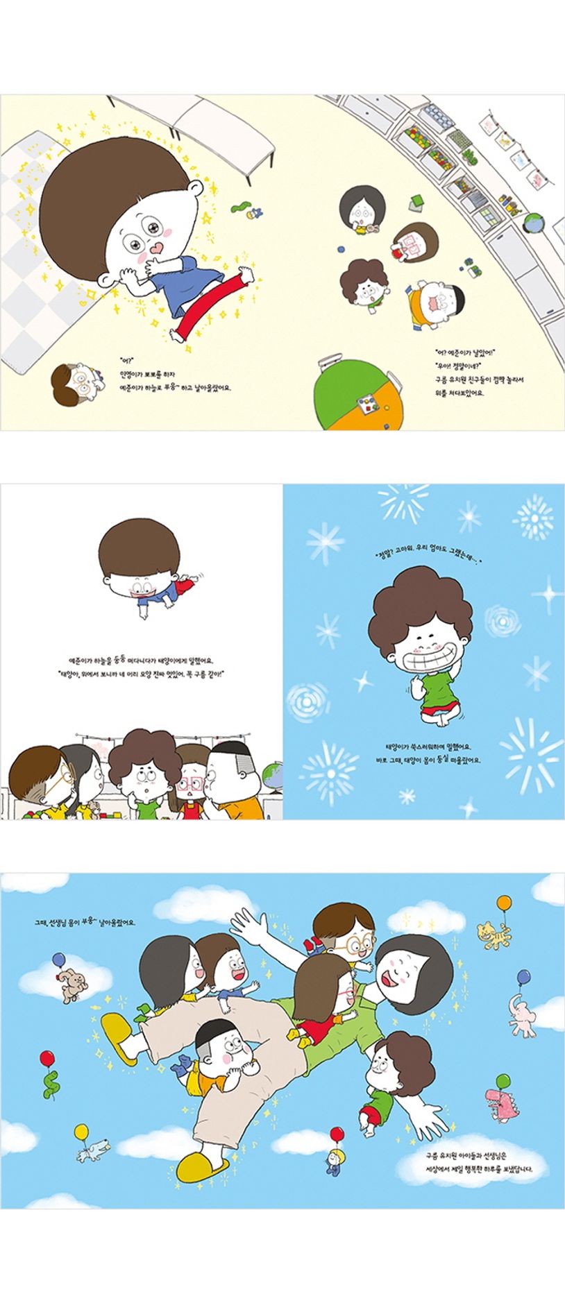 왁자지껄, 우당탕탕! 구름 유치원은 언제나 시끌벅적합니다. 예준이, 민영이, 태양이, 대풍이, 민석이, 정민이, 저마다 다른 개성을 가진 구름 유치원 아이들은 신나게 놀고 툭탁툭탁 싸우고 화해도 하면서 매일매일 즐거운 하루를 보냅니다. 그런데 오늘은 어쩐 일일까요? 구름 유치원 친구들이 모두 행복한 표정으로 하늘 위를 둥둥 날고 있지 뭐예요! 게다가 선생님까지 말이에요. 이 책은 ‘우리가 행복과 기쁨을 느낄 때 습관처럼 생각하곤 하는 ‘날아갈 것 같다’는 말이 진짜로 이뤄지면 얼마나 좋을까!’ 하는 작가의 발칙한 상상에서부터 시작됩니다. 그 상상은 구름 유치원 친구들의 이야기로 실제 이뤄지지요. 구름 유치원 친구들이 서로 칭찬하고, 사과하고, 좋아하는 친구한테 뽀뽀를 받으면서 행복한 마음이 들자, 하늘을 날 게 되었으니 말이에요.