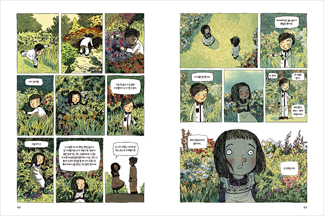 이 책은 전 세계인을 사로잡아온 아동 문학의 고전을 감각적인 그래픽 노블로 재해석한 작품입니다. 필리파 피어스의 《한밤중 톰의 정원에서》를 너무나도 좋아했던 그래픽 노블리스트 에디트는 작품의 배경인 1950년대 고즈넉한 영국의 모습을 아름답게 담아냈습니다. 무엇보다 세밀한 펜 선으로 그린 넓은 잔디밭, 히아신스가 만발한 꽃밭, 아름다운 전나무 등 톰과 해티가 만나는 생명력 넘치는 정원을 눈앞에서 보듯이 생생하게 그린 그림이 돋보입니다. 또한 등장인물들의 감정까지도 드러나도록 세심하게 그려낸 그림은 책을 펼치는 순간, 독자들을 작품 속에 흠뻑 빠져들게 합니다. 독자들은 아름다운 정원에서 톰과 해티와 함께 실컷 뛰어놀기도 하고, 어른이 된 해티 앞에서 유령처럼 모습이 희미해지는 톰의 모습을 보면서 가슴이 덜컹하는 안타까움을 느끼기도 하면서 책 속 인물들과 교감하고 공감하는 멋진 경험을 하게 되지요.