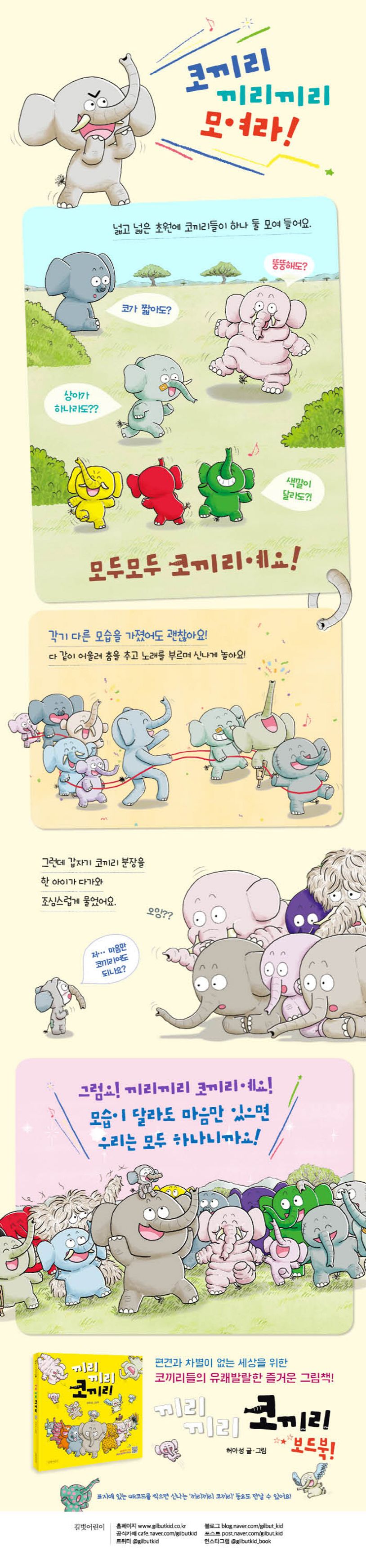 코끼리 끼리끼리 모여라! 넓고 넓은 초원에 코끼리들이 하나 둘 모여듭니다. 코가 짧아도, 키가 작아도, 상아가 하나라도, 색깔이 달라도, 마음만 있어도 모두모두 코끼리예요. 코끼리가 코끼리를 부르고, 코끼리가 코끼리를 부르고…… 모두 다 다른 코끼리들이지만 다 함께 어울려 춤을 추고 노래를 부르며 신나게 놉니다. 모습이 달라도 모두모두 코끼리, 끼리끼리 코끼리니까요!