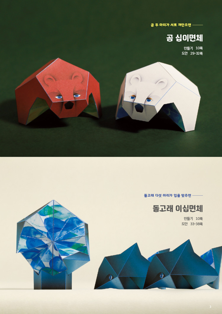 특히 여기에 소개된 다면체들은 다양한 도형들을 완성하는 데에서 그치지 않고 구르거나, 회전하거나, 변신하는 놀라운 작품들입니다. 종이와 풀 등의 간단한 준비물만 있으면 이 모든 작품을 만들 수 있다니 정말 놀랍지 않나요?