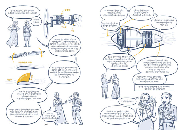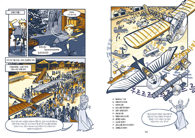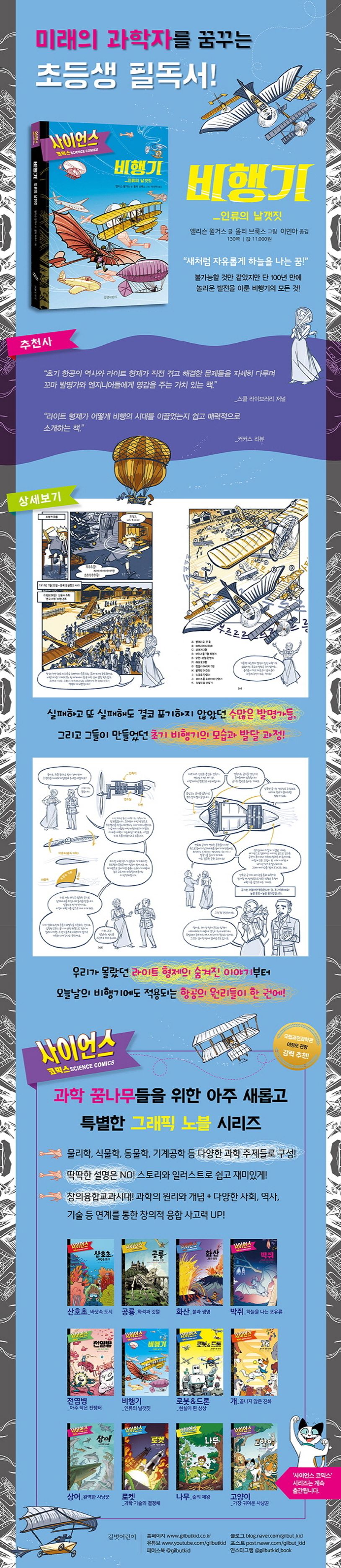 ‘사이언스 코믹스’ 시리즈 제7권 『비행기: 인류의 날갯짓』은 라이트 형제의 여동생 캐서린 라이트가 들려주는 그들의 이야기입니다. 캐서린은 실제로 라이트 형제와 매우 친했습니다. 그들이 만든 비행기를 세상 사람들에게 알리는 데 큰 도움을 주기도 했습니다. 책 속에서 캐서린은 라이트 형제를 비롯한 당대 항공학자들을 소개하며 초기 비행기의 모습과 발달 과정을 알려 줍니다. 라이트 형제가 어린 시절 ‘박쥐’라는 헬리콥터 장난감을 가지고 놀며 비행에 흥미를 느낀 순간부터 마침내 첫 비행에 성공하기까지, 이후 프랭크 휘틀이 터보 제트 엔진을 개발해 오늘날 비행기 모습의 토대를 마련하기까지, 포기할 줄 모르던 항공학자들의 불꽃같은 열정이 펼쳐집니다. 단 한 세기 만에 놀라운 발전을 이룬 비행기 이야기 속으로 떠나 보세요!