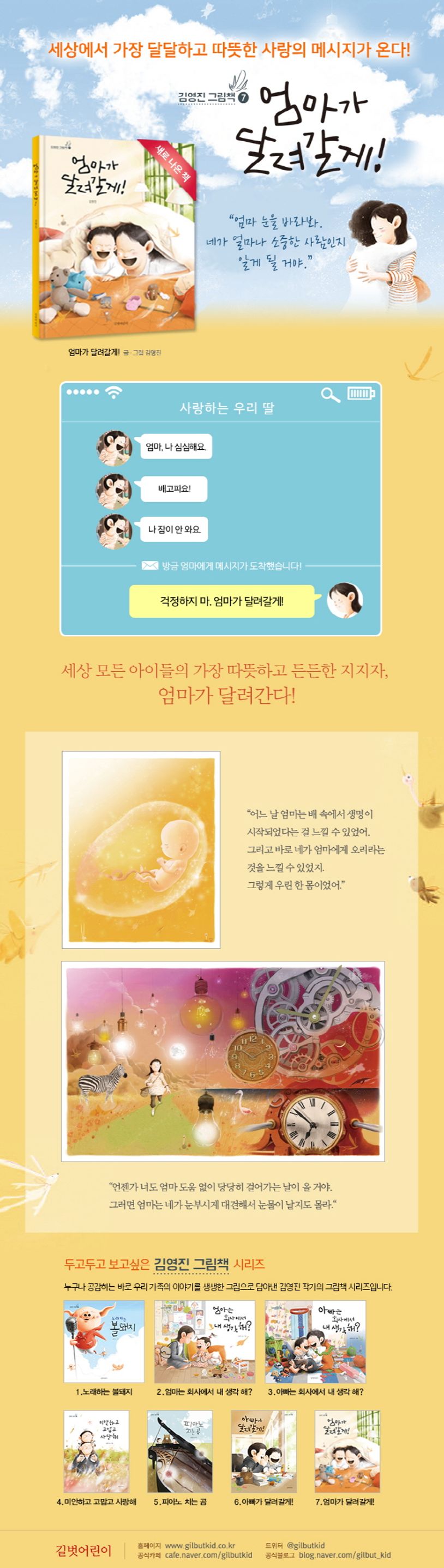 《엄마가 달려갈게!》는 시중에 나온 수많은 엄마 그림책들 중에서도 가장 우리와 가깝고, 가장 쉽게 고개를 끄덕이며 공감할 수 있는 그림책입니다. 이 작품 속의 엄마야말로 바로 내 엄마의 모습이기 때문입니다. 그간 많은 그림책을 통해 가족의 모습을 세심하고 따뜻한 시선으로 그려냈던 작가가 바로 지금, 우리의 이야기를 풀어냈기 때문입니다. 그렇기 때문에 그 어떤 엄마 그림책보다 더 오랫동안 아이들의 마음속에 깊이 남아 있게 될 것입니다.