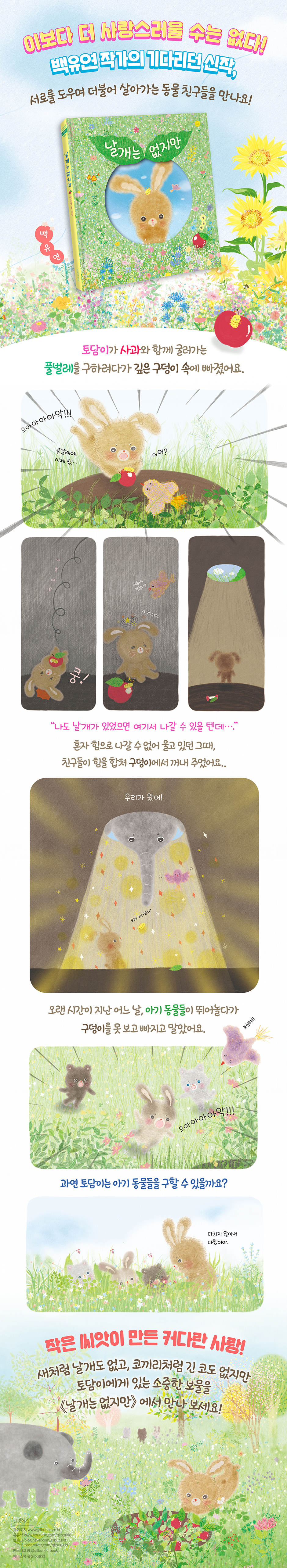 《날개는 없지만》은 토담이가 구덩이에 빠지면서 벌어지는 이야기를 통해, 숲속에 사는 친구들이 각자의 방법으로 서로 도우며 살아가는 모습을 그리고 있습니다. 귀엽고 사랑스러운 그림과 이야기로 어린이들의 사랑을 듬뿍 받고 있는 백유연 작가는 이번에는 작은 사과 한 알이 소중한 희망으로 자라고, 토끼, 풀벌레, 새, 코끼리 등 외모도 성격도 너무나 다른 동물 친구들이 서로 돕고 의지하며 우정을 쌓아 가는 이야기를 합니다. 이제 더욱 사랑스러워진 동물 친구들과 함께 사과 향기로 가득한 숲속으로 여행을 떠나 보세요!