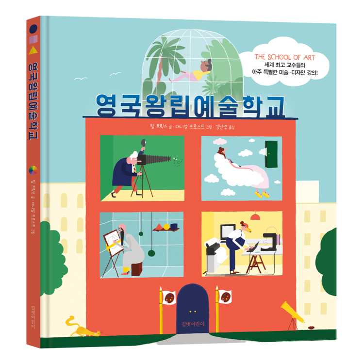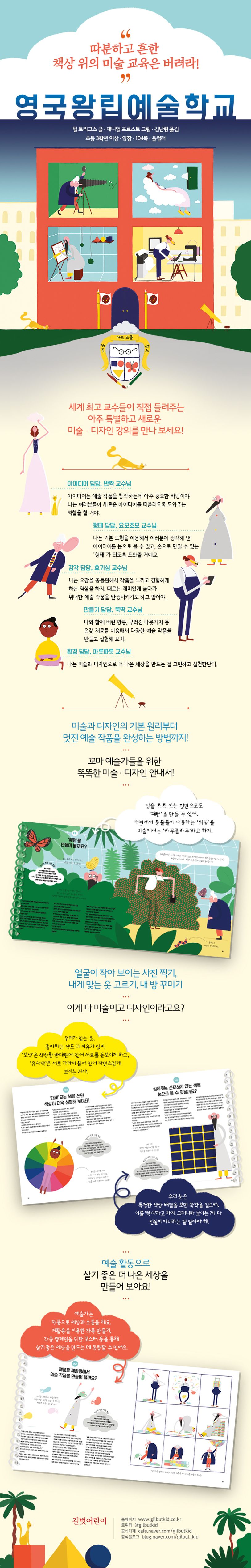 꿈꾸는 세계를 창조하는 어린이 예술가들을 위한 미술, 디자인 안내서『영국왕립예술학교』. 개성 넘치는 다섯 명의 교수님이 디자인과 예술에 대한 흥미로운 강의를 들려주는 책입니다. 아이디어 발상 수업을 맡은 반짝 교수님, 형태에 대해 알려주는 요모조모 교수님, 무엇이든 작품으로 만들어 내는 뚝딱 교수님, 오감을 최대한 활용해 예술 작품을 느끼고 만들도록 이끌어주는 호기심 교수님, 그리고 예술 작품이 단순히 아름다움을 창조하는 것을 넘어 우리의 삶과 환경을 이롭게 할 수 있도록 도와주는 파릇파릇 교수님까지 학생들이 스스로 답을 찾아갈 수 있도록 끊임없이 질문하고 함께 탐구할 수 있게 이끌어줍니다.