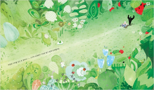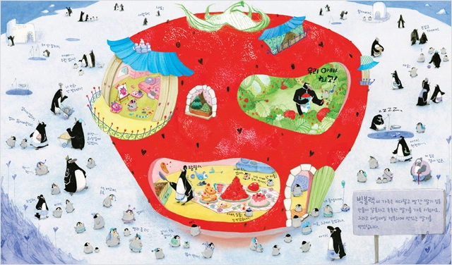 상상하는 모든 것은 아기 펭귄들의 다양한 표정과 배경으로 드러나고, 따뜻한 나라의 숲에는 곰이며 사자 같은 온갖 동물이 익살맞게 숨어 있어요. 아빠 펭귄이 모험 중에 만난 벼랑 끝에 있던 새는 아빠 펭귄을 쭉 따라와서 커다란 딸기 집 지붕에 둥지를 꾸미고요. 커다란 딸기 집 주위에는 추운 나라의 펭귄들이 왁자지껄 분주합니다. 이처럼 장면마다 구석구석 볼 것이 많은 그림이 아이들에게 이야기를 보는 재미를 더해줍니다.