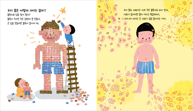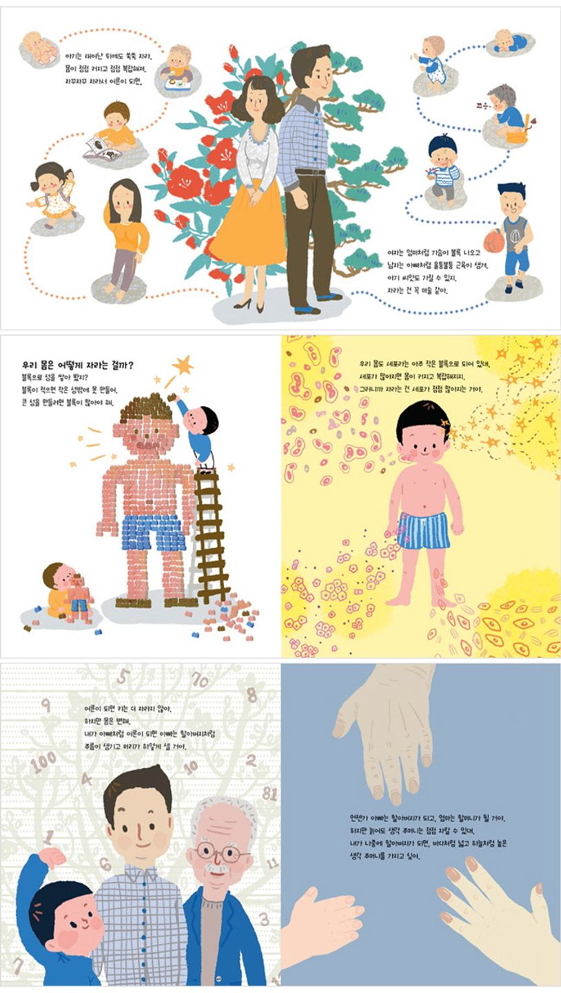게다가 세포가 점점 많아질수록 몸이 자란다는 사실을 장난감 ‘블록’으로 비유해 아이들의 놀이 경험에서 쉽게 연상시키고, 두뇌의 복잡한 활동을 무한대로 늘어나는 ‘생각 주머니’로 떠올려 어려운 과학적 용어 없이도 정확하게 일러줍니다. 주인공 아이의 심리를 과학적 호기심으로 연결시키며 “아! 그럼 엄마 배가 커지는 만큼 동생이 크고 있었네. 나처럼 복잡해지고 있었네.” 하고 말하거나 “고양이도 코끼리도 점점 자라 어른이 된 거래!”라며 세상 모든 동식물의 성장으로 확장시켜 나가기도 하지요. 특히 성장과 노화라는 상반된 개념을 다시금 환기하면서 “늙어도 생각 주머니는 점점 자랄 수 있대. 내가 나중에 할아버지가 되면 바다처럼 넓고 하늘처럼 높은 생각 주머니를 가지고 싶어!” 라고 언급하며 ‘늙는다’는 의미를 성장이라는 범주 안으로 포함시켜 기존의 고정관념을 뒤집기도 합니다.