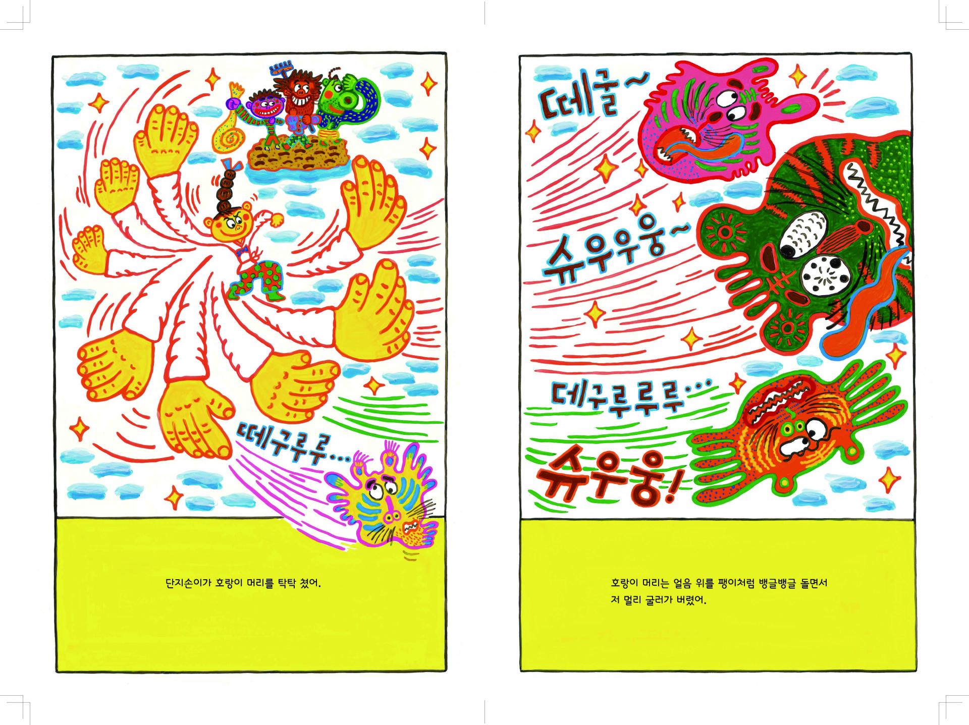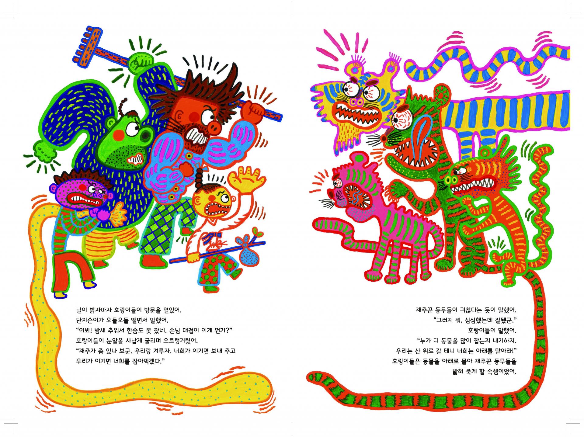 호랑이들과의 위험한 내기에서 이긴 재주꾼 동무들은 세상을 활보하는 데 거칠 것이 없습니다. 세상이란 경험해 보지 못한 곳이며 모든 가능성이 열려 있는 곳입니다. 세상으로 나간다는 것은 호기심을 자극하는 만큼 두려움을 불러일으키지요. 재주꾼 동무들은 무서운 호랑이들 앞에서도 조금도 겁먹거나 위축되지 않고 당당히 맞섰습니다. 부모 품에서 벗어나 세상으로 나아가야 할 아이들에게 재주꾼들의 호쾌한 모험 이야기는 세상에 대한 두려움을 이겨 낼 힘과 용기를 불어넣어 줍니다.