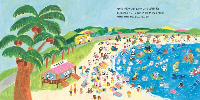 작가는 이야기 속에서 끊임없이 독자들의 호기심과 상상력을 자극해요. ‘도넛 트럭의 주인인 펭타는 어째서 해수욕장에 왔을까?’, ‘펭타는 특별 주문 도넛을 왜 자꾸 이상한 모양으로 만드는 걸까?’, ‘펭타는 왜 코끼리에게 머리 위의 커다란 도넛을 팔지 않을까?’ 등등 독자들은 책을 읽으며 스스로 다양한 답을 상상해 보게 되지요.