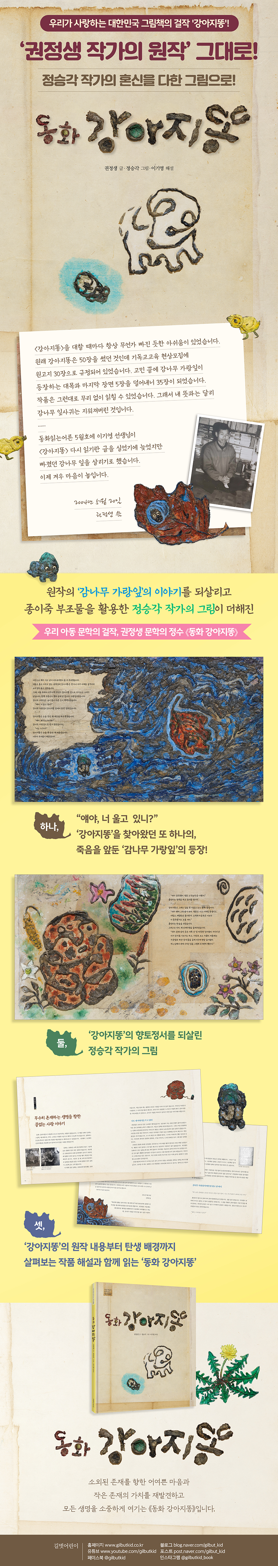 《동화 강아지똥》은 원작 동화와 함께 이기영 선생님의 작품 해설을 넣어 권정생 선생님이 〈강아지똥〉을 쓰게 된 배경과 《동화 강아지똥》이 출간되기까지의 과정을 촘촘하게 짚어보며 ‘동화작가 권정생’의 시작과 한국 아동 문학의 걸작의 탄생을 생생하게 만나도록 하였습니다.