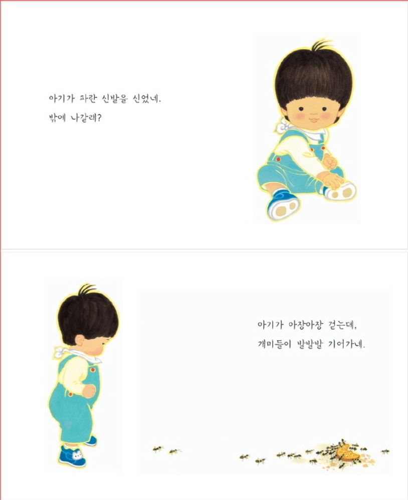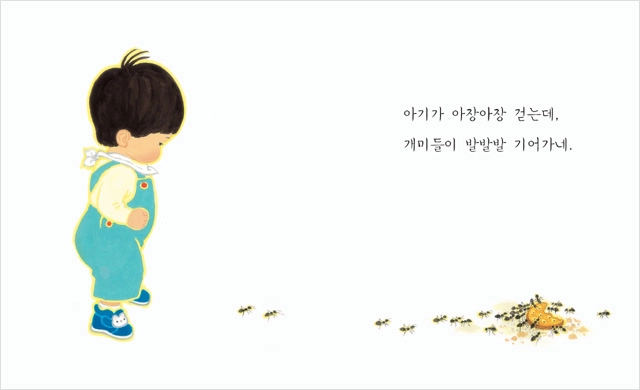 아이와 산책을 할 때, 눈에 띄는 것들이나 아이가 관심을 보이는 것들이 무엇인지 일러주곤 하지요. “개미가/ 발발발/ 기어가네, 참새가/ 오종종/ 앉았네’와 같은 글은 엄마가 아기에게 말을 하듯 자연스럽고 정겹습니다. 3음보의 운율에 리듬감이 느껴지며 아장아장 걷는 아기의 모습이 떠오르지요.