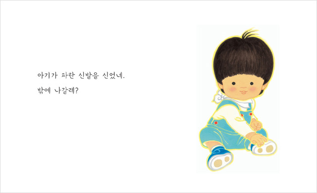 이 책에서는 주위에서 쉽게 만날 수 있는 동물과 또래 친구가 등장해서 아기가 주변에 관심을 두고 관계를 맺는 모습을 보여줍니다.
