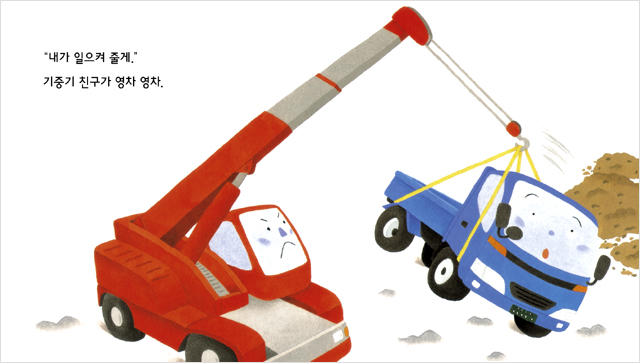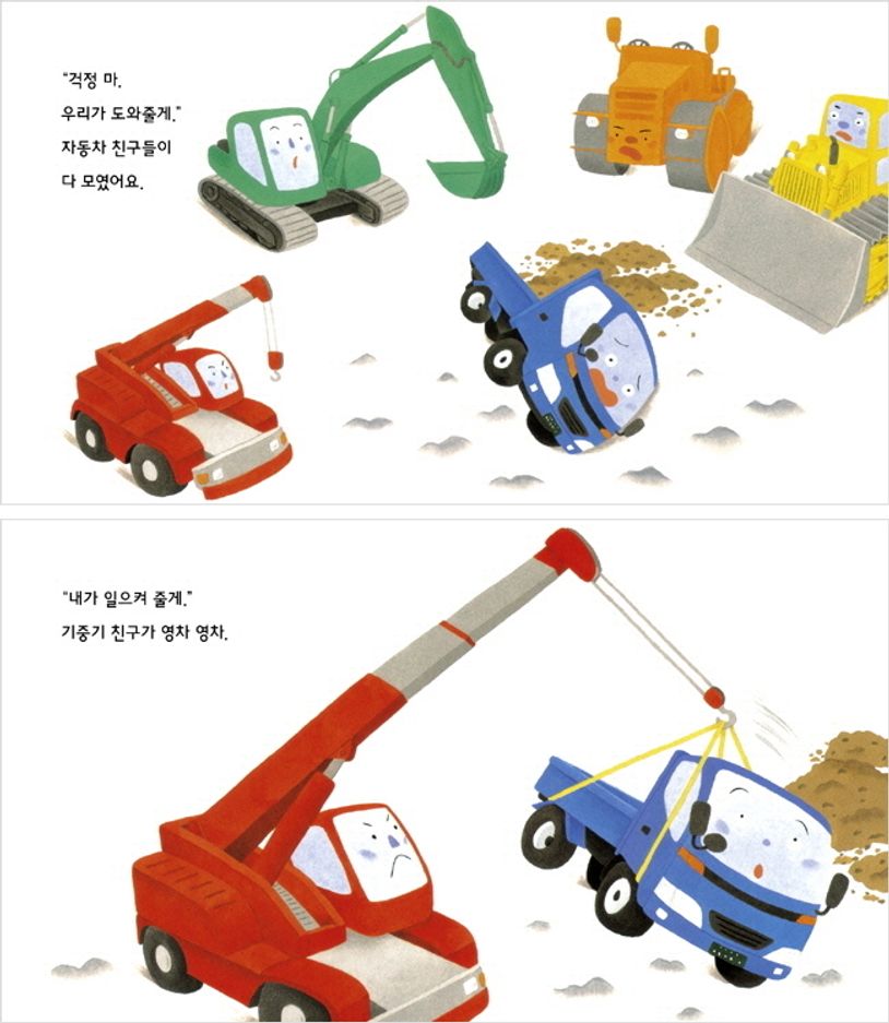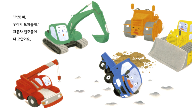경쾌한 글과 귀여운 중장비 친구들의 그림이 잘 어우러져 친구를 돕는 즐거운 분위기가 잘 살아났어요.