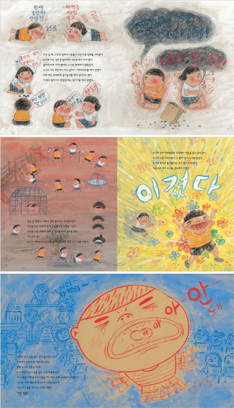 한상언 그림작가는 수채 물감과 과슈(수용성의 아라비아고무를 섞은 불투명한 수채물감), 펜, 연필, 크레파스 등 여러 재료를 이용해서 누나와 동생 사이에 벌어지는 일들을 유쾌하게 그렸습니다. 장면 곳곳에 말풍선을 달고 등장인물의 표정이나 동작을 과장하면서 특유의 스타일을 살려 재치 있게 표현하고 있지요. 그래서 사이좋게 놀다가도 티격태격 다투는 모습(8~9쪽), 다정하게 그림책 보는 모습(10~11쪽), 운동장 곳곳을 신나게 달리는 모습(16~19쪽) 등 여느 가정에서나 있을 법한 상황들이 보다 재미있고 개성 있게 느껴집니다.