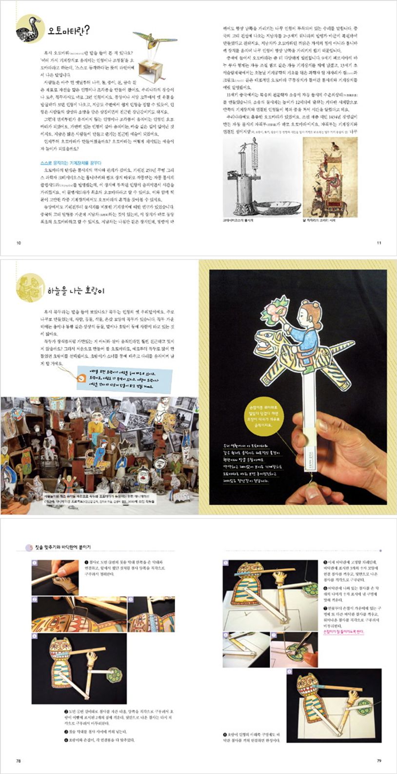 특히, 각자가 만든 오토마타를 만들어 전시하거나, 여러 사람과 공동 작품으로 함께 만들어보는 모든 과정이 오토마타를 즐기는 놀이이자 예술이 될 수 있습니다. 실제로 아이들이 만든 오토마타 작품들을 실은 〈친구들이 만든 오토마타〉와 스톱모션 기법을 이용한 〈오토마타로 애니메이션을!〉 꼭지를 보면, 같은 기계장치에 인형 그림이나 생각을 바꾸는 것만으로도 얼마나 다양하고 기발한 오토마타가 만들어지는지 확인할 수 있습니다.