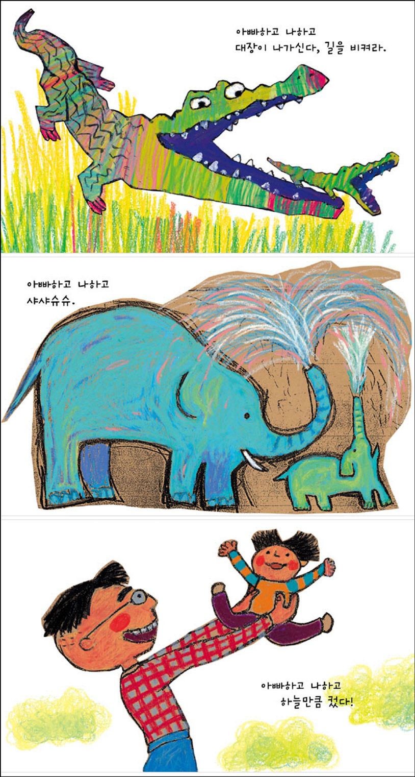 이 책에 나오는 대장 놀이, 힘자랑, 달리기 같은 여러 가지 놀이는 모두 아빠들이 잘할 수 있는 놀이들이에요. 아빠가 이 책을 읽어 주면 아이는 당장 동물 아빠들처럼 놀아 달라고 할 거예요. 거침없는 선과 선명한 색으로 표현한 그림은 동물 아빠와 아기의 활달한 움직임과 즐거운 분위기를 잘 살려 줍니다. 아이들에게 무엇보다 중요한 것은 아빠와 함께한다는 것이겠지요. 장면마다 “아빠하고 나하고”로 시작하는 글은 아빠와 아이의 유대감을 강조하고 친밀감을 더해 줍니다. 책장을 넘기며 놀이를 이어갈수록 아빠와 아이의 사랑과 믿음이 굳건해지는 걸 느낄 수 있어요. 아이를 바라보는 아빠의 눈빛에는 자식을 아끼고 사랑하는 마음이 가득하고, 아이의 모습에서는 힘세고 용감한 아빠를 자랑스러워하는 뿌듯함이 묻어납니다.